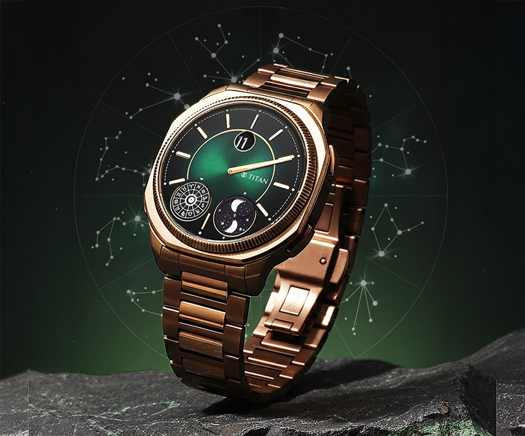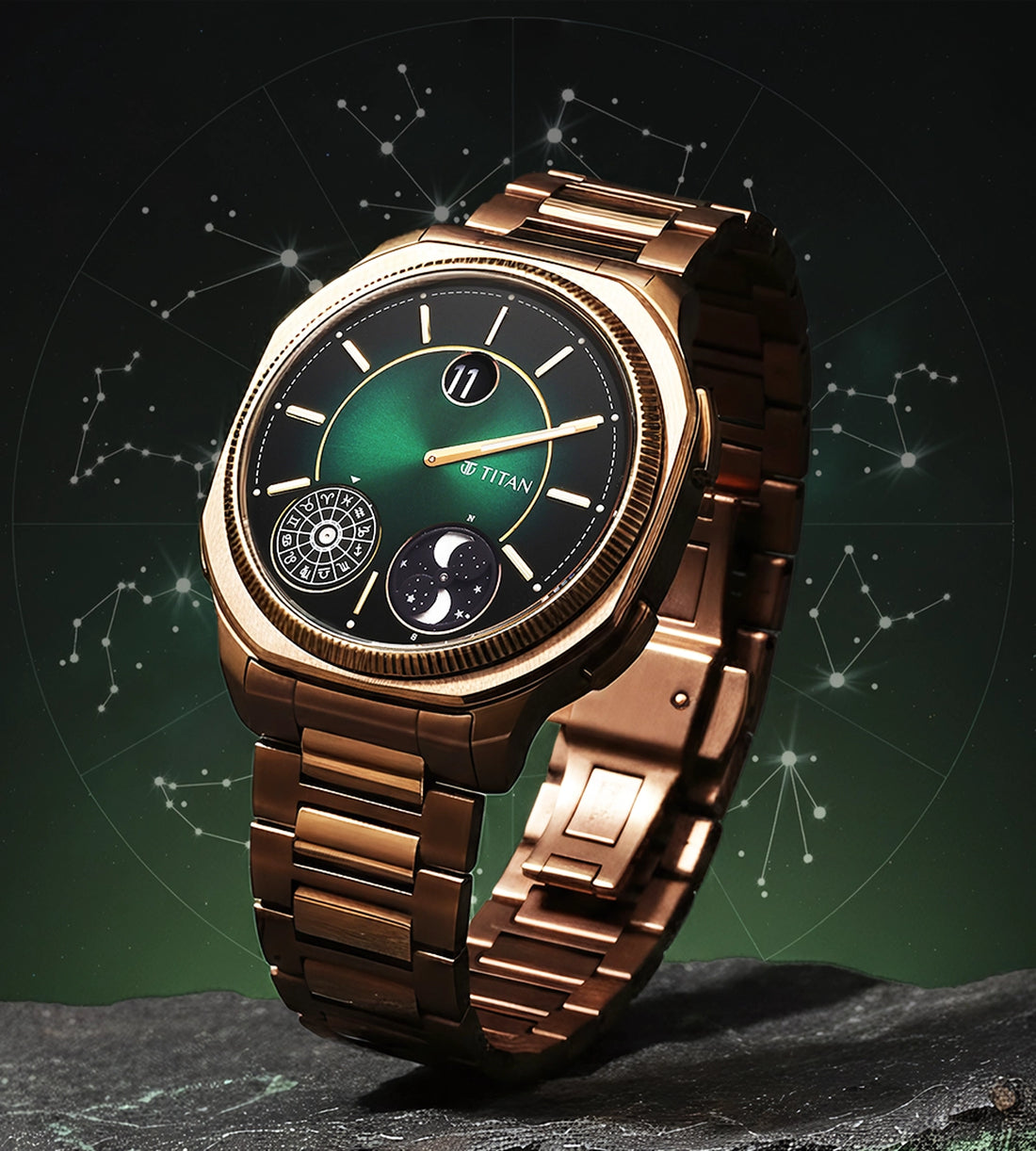 Titan Stellar Jumping Hour Micromotors Zodiac Analog with Dual Moonphase and Green Dial Bronze Stainless Steel Watch for Men - The Zodiac model celebrates classical astronomy with a functional zodiac disc, dual moonphase, and jumping hour complication. Engraved interpretations on the back case deepen its cosmic storytelling, making it a true horological conversation piece. The watch runs on Titan's in-house Micromotor calibre, engineered for precision and rare complications. Available in Emerald Zodiac and Bronze Zodiac editions, this model is a collector's tribute to the constellations.